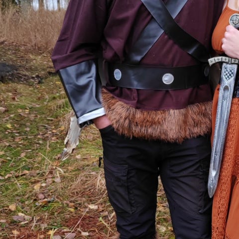 Miesten viikinkiasu kokoa XL naamiais- tai pukujuhlakäyttöön. Asuun kuuluu musta yläosa koristeellisilla reunuksilla ja vihreillä hihoilla, mustat housut, pitkä musta viitta turkisjäljitelmäkauluksella sekä vyö. Materiaali on pehmeää, joustavaa, samettimaisen näköistä kangasta. Asu soveltuu esimerkiksi naamiaisiin, teemapäiviin tai esityskäyttöön. Ollut miehellä polttariasuna, kerran siis käytetty. jotain pientä käytön jälkeä on, mutta täysin toimiva kampe seuraavalle. Mukana muutakin erikseen ostettua sälää, kilpi (tässä polttaritekstejä tussilla kirjoitettuna), miekka, veniz vyö, kirves (tässä ei jatkovartta tallessa, mutta käy noin lyhyemmälläkin varrella) ja lisäksi puhallettava pieni nukke, en tiedä onko reikiä, enkä ala puhaltamaan ja kokeilemaan pysyykö ilma.