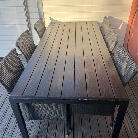 Viime keväänä hankittu polyrottinkinen ruokailuryhmä. Myydään muuton vuoksi.