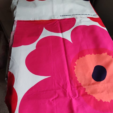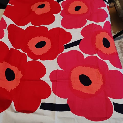 Marimekko Unikko kangas keltainen-valkoinen. Kankaassa on Maija Isolan suunnittelema Unikko-kuosi, jossa on suuria valkoisia kukkia keltaisella taustalla ja oransseja kukkien keskustoja. Sopii esimerkiksi sisustustekstiileihin, verhoihin, pöytäliinoihin tai ompeluprojekteihin. Materiaali vaikuttaa puuvillakankaalta, tarkka koko ja pituus eivät käy ilmi kuvista.90x 145 cm tästä saa esm.3 tyynyä 45x45 cm.Vain nouto ja käteismaksu.