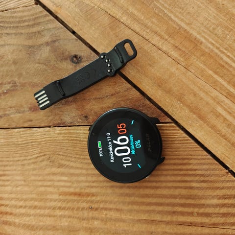 Vähällä käytöllä ollut urheilukello, jossa pyöreä näyttö ja musta silikoniranneke. Mukana tulee laturi. Kellon näytössä näkyy digitaalinen kellonaika ja perustoiminnot. Nopeat kaupat.