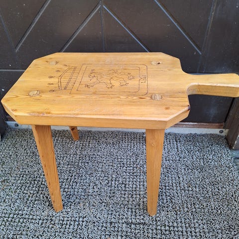 Tukeva jakkara, leveys/syvyys 43/20cm, korkeus 28cm. Patinaa on mutta rakenne kunnossa