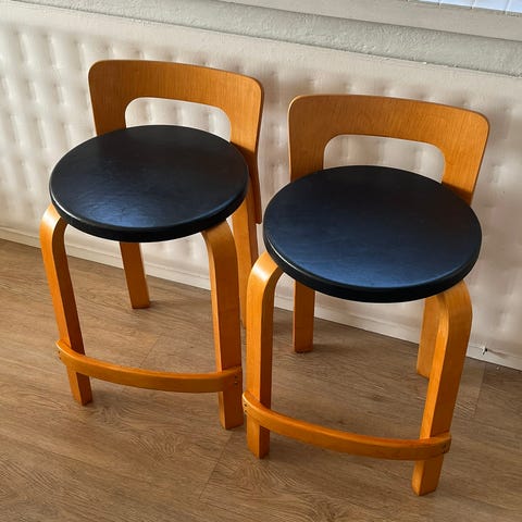 Kohtalaisen siistit Artek-tyyliset tuolit (ei aidot). Käytön jälkiä, mutta ei koloja ja yläpinnat mekaanisedti ehyet. Pienellä laitolla saa todella siistit jakkarat. Hinta yhteensä.
