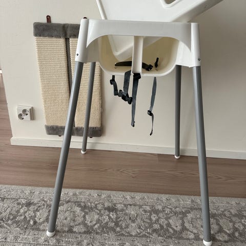 Jollyroom syöttötuoli, ehjä ja hyvässä kunnossa. Kokoon taitettava. Korkea malli, irrotettava tarjotin. Istuimessa turvavyöt lapsen kiinnittämistä varten sekä jalkatuki. Sopii pienille lapsille ruokailuun pöydän ääressä. Muovinen istuinosa on helppo pyyhkiä puhtaaksi käytön jälkeen tai menee astianpesukoneessa myös.