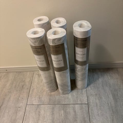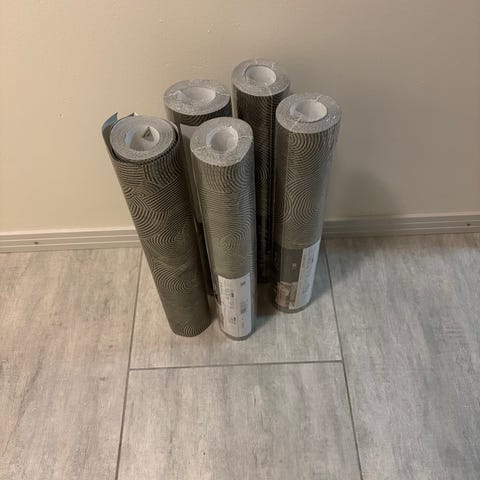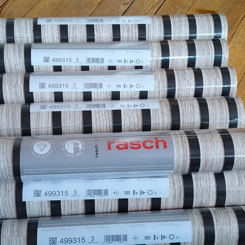 Kaksi uutta rullaa ja yksi vajaa tapetti rulla. Pysty raita tapetti. Violetti. Vain nouto ja käteismaksu.