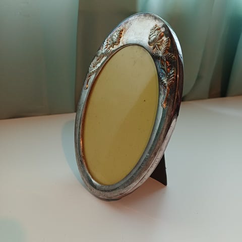 Hyvin vanha valokuvakehys joka on paksua kuparia, paino noin 1 kg. Korkeus 29 cm. Aukon leveys 9 ja korkeus 13,5 cm.