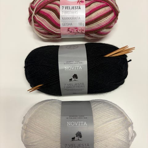 Myydään fazerin x novitan salmiakkisukat lankapaketti. Mukana ohje, puikot ja lankakerät. Toisessa kuvassa kolme kerää Novita 7 Veljestä Nummi -lankaa. Kaikki yhteensä 25