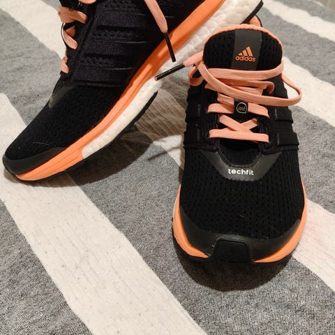 Adidaksen kivat lenkkarit. Sinisellö pohjalla valjoisia pisteitä. Hyvä iskunvaimennus, nauhakiinnitys ja hyvät jalassa. Koko 37,5, vastaa kokoaan. Naruissa vähän nyppyä ja valkoisessa osassa tummentumaa, yleisilme siisti.