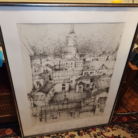 Kuvan Hilkka Inkalan grafiikka taulu. 1976 Oulusta. Kehys 100x74cm.Lohjalla.
