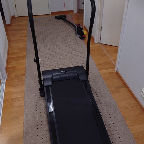 Musta juoksumatto kotikäyttöön. Laitteessa on käsituet ja edessä näyttö, josta voi seurata harjoittelutietoja. Soveltuu kävelyyn ja kevyeen juoksuun sisätiloissa. Ei toimi sähköllä! Vain kasatti ja todettu meille turhaksi, laatikko meni purkaessa rikki joten en saa tätä palautettua. Hinta on mietitty enkä sitä laske kun tappiota tässä muutenkin tulee.