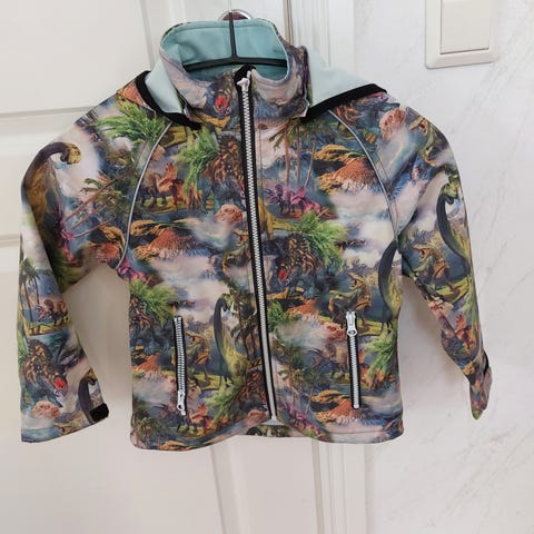 Finlaysonin värikäs softshell välikausitakki kokomerkinnällä 110/116. Mielestäni reilu kokoisekseen.