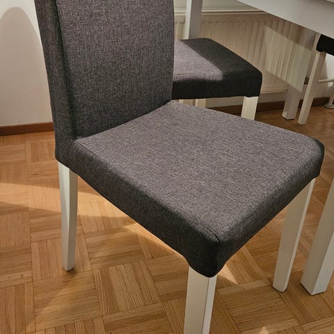 Hyväkuntoinen pöytä ja 2 tuolia. Tuolien pehmusteet kuuluvat hintaan.