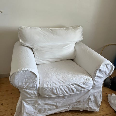 Ektorp Nojatuoli valkoisella päällisellä, jossa puutteita kts.kuvat. vaatii uuden päällisen.