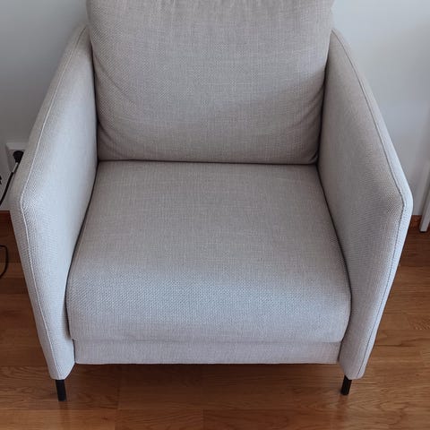 Siisti, hyväkuntoinen, puhdas ja erittäin mukava harmaa nojatuoli, jossa verhoiltu kangaspinta ja mustat metallijalat. Näitä on 2 kpl myynnissä - hinta erikseen 70 €, yhteensä 130 €.