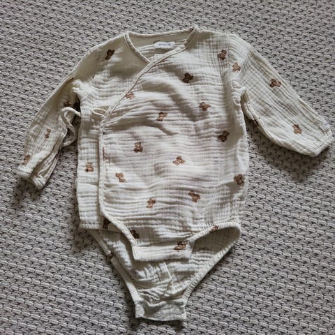 Newbien siisti, muutaman kerran käytössä ollut vauvan body, koko 68, unisex, pitkät hihat ja kuviollinen printti. Haarassa nepparikiinnitys vaipanvaihdon helpottamiseksi. Materiaali 100 % puuvillaa.