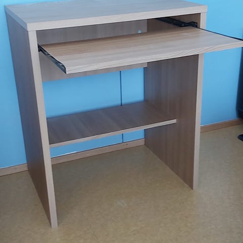 Siistikuntoinen tietokonepöytä jonka pöytälevy 2 osainen, joten purettaessa kulkeutuu pienessäkin tilassa.