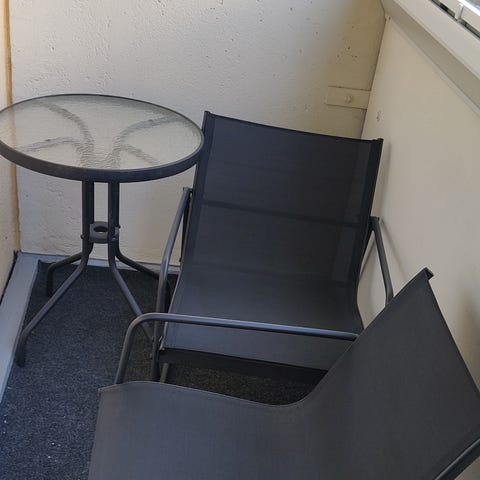 Kaksi kuvan ehjää parveketuolia. Yllättävän tukevat ja miellyttävät istua.