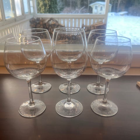 Täysin ehjät viinilasit herra Tabermannin rakkausrunoilla. Toisessa lukee Muurla pohjassa. 5 e kappale. Mieluiten molemmat kerralla kympillä.
