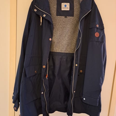 Vuoriton parkatakki, kevättakki, ulkoilutakki, tuulitakki. Reilu koko 38. Isot taskut edessä, säätövyötärö, huppu. Pituus 80, kai-kai 55.
