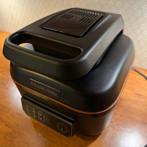 Russell Hobbs airfryer. Laitteessa on irrotettava paistokori ja ritilä, jotka helpottavat puhdistusta. Sähköjohto tavallisella pistotulpalla. Soveltuu pienen määrän kypsentämiseen