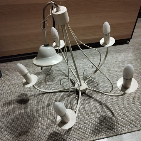 Kaksiosainen rustiikkinen metallinen kattovalaisin harmaalla, hieman patinoidulla pinnalla. Valaisimessa on kaksi alaspäin suunnattua kupua ja keskellä kattokuppi, johon sähköjohdot ja kiinnitysrauta tulevat. Sopii esimerkiksi ruokapöydän, keittiön tai työtilan yleis- tai kohdevalaistukseen. Ostettu aikoinaan Ellokselta, mutta ei sopinut uuteen kotiin. Leveys 70 cm ja kork. 30 cm.