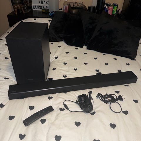 TCL TS9030 3.1 Ray Danz soundbar ja langaton bassokaiutin+kaukosäädin + HDMI kaapeli. Yläpuolen maalipinnassa hankauma tyyppinen vaalea alue (näkyy kuvassa). Toimiva, myyn tarpeettomana telkkarisysteemin uusimisen takia. Kytkentä televisioon HDMI kaapelilla. Uusi kaupassa n. 190€. Nouto tai sopimuksen mukaan lähetys.