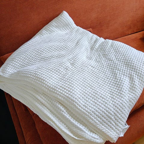 IKEAsta ostettu tummansininen samettipintainen ohuehko päiväpeite. Tikattu pinta muodostaa vinoruutukuvion. Jäi käyttämättä, kun väri ei sopinutkaan. Väri on kuitenkin kaunis mustikan sininen. Kuvassa 180 cm leveässä sängyssä.