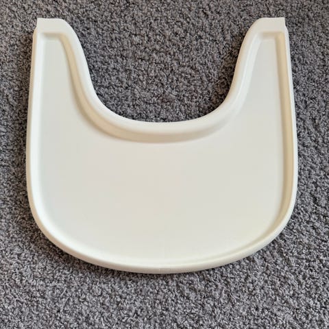 Stokke syöttötuolin tarjotin. Väri valkoinen ja materiaali muovia. Sopii käytettäväksi Stokken syöttötuolin kanssa lapsen ruokailu- ja leikkihetkiin erillisenä ruokailutasona. Muotoilu helpottaa tarjottimen kiinnittämistä ja irrottamista tuolista sekä puhdistamista käytön jälkeen.