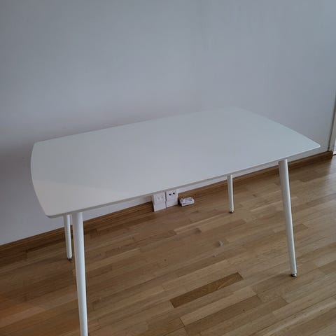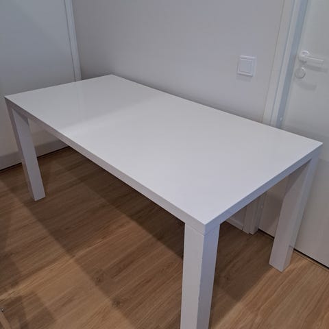 Siisti valkoinen jatkopalallinen ruokapöytä. Jatkopalalla pituutta saa 40cm lisää. Pieniä kolhuja ja kellertävä pieni värjäymä pöydän pinnassa, joka ei selkeästi erotu. Jalat saa irti kiljetusta varten. Nouto sulunperäntie 6