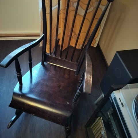 Mustaksi maalattu vanha käsityönä valmistettu keinutuoli. Jalasten päällä messinkiset koristeet. Jonkin verran kulumaa, mutta yleisilmeeltään siisti. Jäänyt tarpeettomaksi.