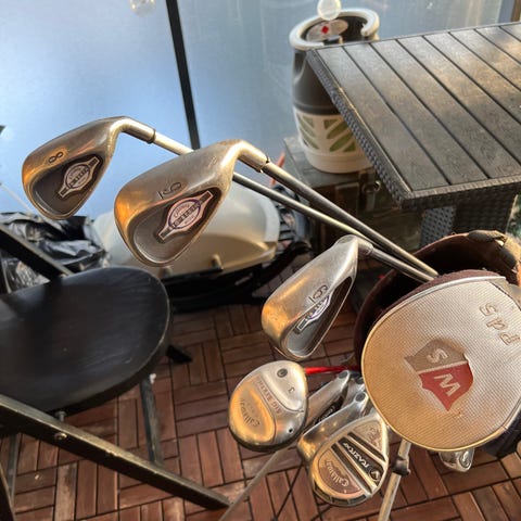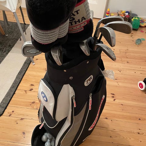 Callaway golfmailasetti bägin kanssa. Settiin kuuluu useita rautoja sekä puumailoja ja wedgejä, kuten kuvista näkyy. Mailojen lavat ovat metallia ja varret metallia tai komposiittia mallista riippuen. Bägi on kevytrakenteinen kantobägi, jossa on jalustat, useita taskuja ja kantoviilekkeet. Väri pääosin vaaleanharmaa oransseilla ja valkoisilla yksityiskohdilla. Soveltuu yleiseen golfpelaamiseen ja harjoitteluun. Tarkemmat mailamallit ja määrät ilmenevät kuvista.