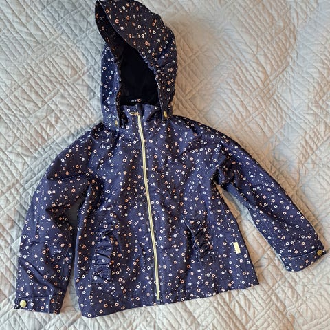 Cirafin takki, koko 116. Takissa on monivärinen perhoskuviointi vaaleansinisellä pohjalla ja kiinteä huppu. Edessä on vetoketjukiinnitys. Vuori on vaaleanpunainen. Takissa on kestotahroja, mutta takki on niin värikäs, ettei näihin kiinnitä niin huomiota. Tosi söpö takki ja tyttöni piti tästä paljon.