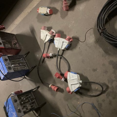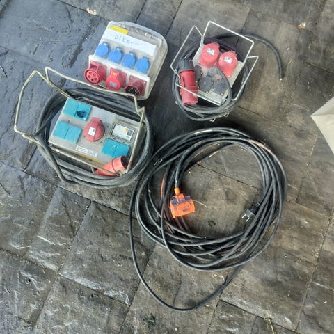 Sähköjakokeskus yli 14m jatkokaapelilla. Keskuksessa on yksi punainen voimavirtapistorasia ja kolme sinistä pistorasiaa. Laite on suojakaaren sisällä ja siihen kuuluu kiinteä, paksu kumikaapeli punaisella voimavirtapistokkeella. Sopii esimerkiksi työmaa- tai varastokäyttöön sähkön jakamiseen usealle laitteelle samasta syötöstä.