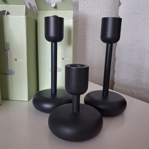 Iittala kynttilänjalat musta. Kaksi erikorkuista, metallista valmistettua kynttilänjalkaa leveällä, pyöreällä jalustalla. Sopivat pöytäkynttilöille tai kruunukynttilöille mallista riippuen. Pohjassa huopapinta ja Iittala-logo, jotka suojaavat alustaa naarmuilta ja pitävät jalat tukevasti paikallaan. Soveltuvat sisäkäyttöön kodin yleisissä tiloissa, kuten olohuoneessa, ruokapöydällä tai sivutasolla.