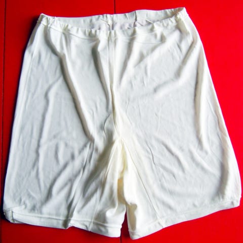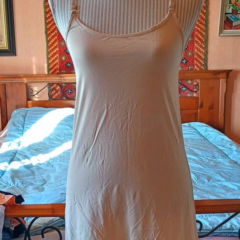Valkoinen alusmekko. V-pääntie, kiinteät olkaimet. Löytyy 2 kpl; kokolapussa XL (vastaa M/L, kai-kai n. 43 cm, pituus kainalosta helmaan n. 68) ja 4XL (vastaa 2XL, kai-kai n. 57 cm, pituus kainalosta helmaan n. 73 cm).