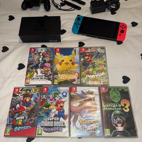 Nintendo Switch -pelikonsoli Joy-Con-ohjaimilla ja peleillä