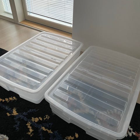 Myydään kaksi Orthexin sängynaluslaatikkoa vaaleanpunaisilla kansilla ja pyörillä. Pyörät voi irrottaa. Toisen laatikon kaksi pyörää ei pysy kunnolla paikallaan (ks. kaksi viimeistä kuvaa). Normaalia käyttökulumaa, perussiistit. Koko 75,5x50x17cm. Vain nouto.