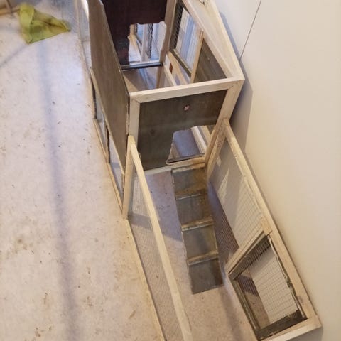 Talven ulkona ollut häkki, kaipaa pientä korjausta ja puhdistusta. Vaikka marsuille tai kanille ulkoiluhäkiksi. Kaltereita jo vähän vääntynyt mutta pysyy kasassa. Mukaan saattaa löytyä ainakin juomapullo ja taso, jossa pesäkolo ja ruokakuppi tason päällä. Koko n.P118 x L59 x K52. Löytyy zooplussalta nimellä ferplast rabbit 120-pieneläinhäkki.