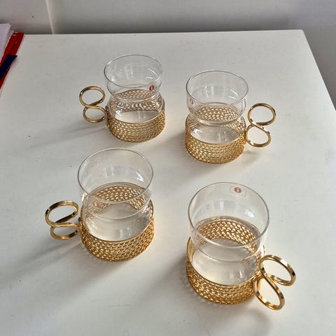 Kaksi vanhaa Iittalan Tsaikka sarjan lasia pidikkeineen. Toisessa lasissa iittala-tarra.