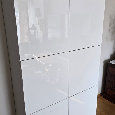 2kpl Ikea Bestå kaapit korkeakiiltovalkoisilla ovilla. Yleisilmeeltään hyvässä kunnossa. Pientä käytönjälkeä ja ruuvinreikiä, kun on ollut yhdessä kiinni. 6kpl hyllyjä. Mitat 120x42x128