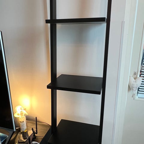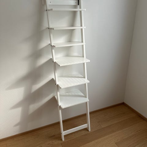 Kotimaisen Rintaluoman valmistama tikashylly. Valmistumateriaali kalustelevyä. Kippiovella varustettu kaappi nahkavetimelläja kolme avohyllyä.