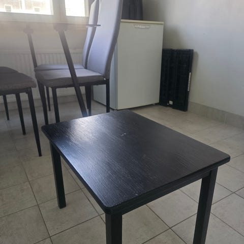 Annetaan pieni, mustaksi maalattu sivupöytä. Vaatii ehkä uutta pintaa.