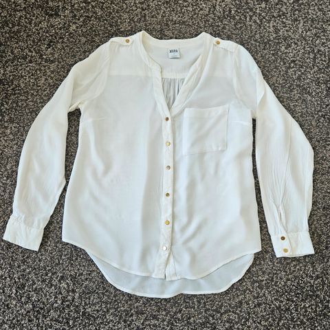 Valkoinen klassinen paitapusero, jossa kangaspäällysteiset napit.