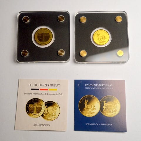 999 puhdasta kultaa2 x 1/500 ozHuomaa, että tässä erässä on pieniä kultakolikoita tai -mitaloja, jotka on tehty erittäin ohuesta kullasta. Koska ne ovat hauraita ja taipuvaisia, tällaiset esineet ovat usein kiinnitetty akryyliin tai kapseloitu muoviin vahingoittumisen välttämiseksi. Jos teillä on kysyttävää tästä erästä, ottakaa rohkeasti yhteyttä.Katso kuvat oikean vaikutelman varmistamiseksi.Tuote lähetetään rekisteröidyllä kirjeellä seurantakoodin kanssa.