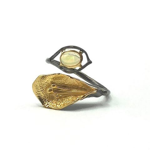 Tämä sormus on peräisin rajoitetusta Twilight-Editionista, suunniteltu ja toteutettu Alexandra Steinforthin (Ale jewels) toimesta, korujen ja taiteen alalla lisensoitu.Se on täysin käsityö- ja käsin taottu kappale, joka yhdistää hopean osaa ja kiinteän 18 karaatin kultaisen osuuden sekä suunnitteluun integroidun luonnollisen PearlHelmen.Kyseessä on avoin, säädettävä konsepti koossa 16/17, ainutlaatuinen eikä toistu.Twilight spiraalin muodossa edustaa elämää ilman alkuja ja loppuja.Spiraalin halkaisija on 2,2 cm.Sivupinnoitteet ovat noin 2 mm leveät.Toimitetaan todistettuna ja vakuutettuna seurantanumeron kanssa sekä lahjarasian kanssa, jotta se saapuu vastaanottajalle turvallisesti.