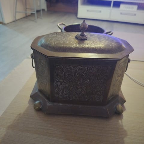 Antiikkinen koru- tai jalokivälaatikko, joka on valmistettu neoklassisen Louis XVI -uuden pehmeän ratsastuksen hengessä. Neliömäinen laatikko koostuu puurakenteesta, ja ulkopuoli on tummanruskeaa puristettua keinotekoista kilpikonnankuoren näköä. Reunat on viimeistelty hienosti profiloidulla metallisella rinnalla, jossa on helmiäiskuvioidut koristeet. Kannessa on keskellä pyöreä medaljonki, jonka klassinen relieefikuva urnusta kukkien kera, ja sen vieressä ovat festoonit (riippuvat ketjut) sekä acanthuslehdet.Relievin taustana metallin takana on vihreä koristekivi tai mineraalikomposiitti, joka toimii kontrastina ornamentille.Laatikon sivut on varustettu pystysillä profiloinneilla, ja niissä on sama metallireunustus. Sisätilat ovat vaaleansinistä samettia ja tarkoitettu pienille koruille tai arvoesineille. Materiaalien, ornamentaation ja rakenteen yhdistelmä on tyypillistä Belle Époque -ajan ylellisille koriste-esineille.
