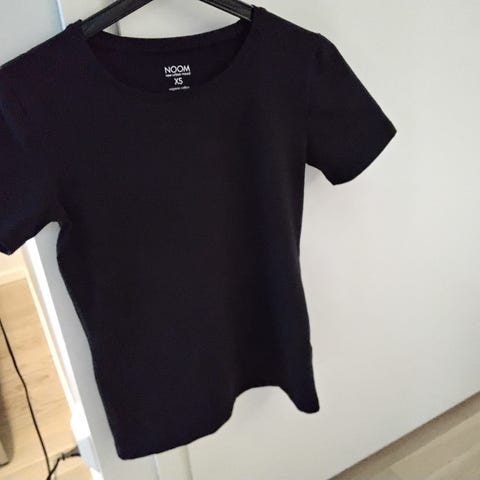 H&M naisten T-paita, koko S. Väri musta. Materiaali polyesteriä. Lyhythihainen, vartalonmyötäinen malli, jossa pyöreähkö pääntie ja edessä pystysuuntaiset leikkaussaumat. Selkäpuoli sileä ilman yksityiskohtia. Sopii arki- ja vapaa-ajan käyttöön esimerkiksi housujen tai hameen kanssa.