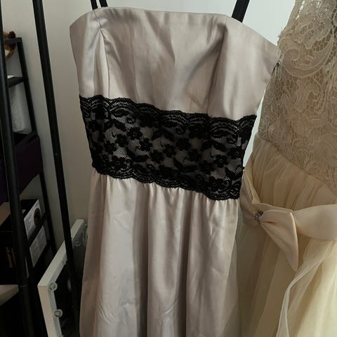 Ihana hopean värinen rippi mekko. Olkain mahdollisuus (ei mukana) pysyy myös ilman, todella napakka silikoni reuna. Ja etumus tuollainen "kova" muotonsa pitävä. takana vetoketju. Kaunis.