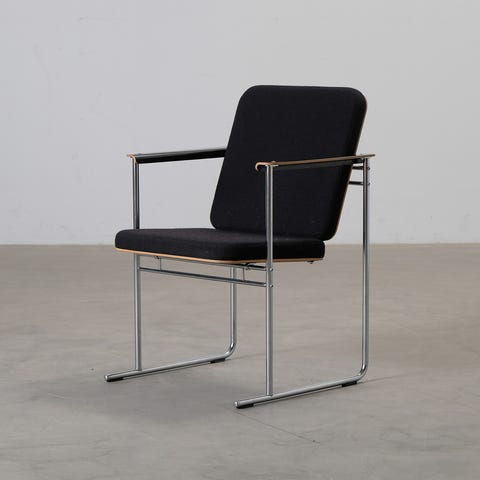 Yrjö Kukkapuron Avartelle suunnittelema Skaala 472 -tuoli. Tuolin istuin ja selkänoja on kevyesti pehmustettu ja mustalla kankaalla. Puusta valmistetut käsinojat ja metallista valmistetut jalat.