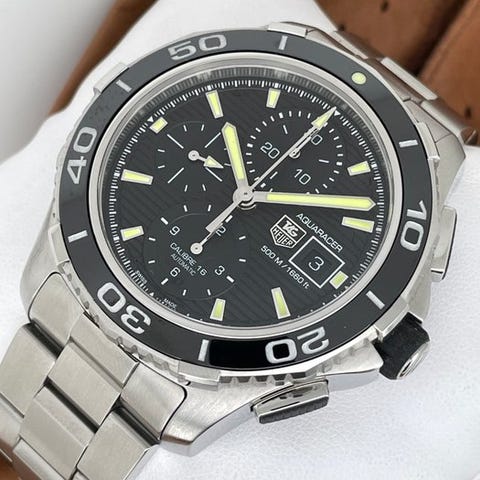 TAG Heuer - Aquaracer Chronograph - CAN1010Kellon kuori: ruostumaton teräsKoneisto: sveitsissä valmistettu kvartsikoneistoLäpä: mustaHalkaisija: 43 mm (ilman kruunua)Lasi: safiirilasiRanneke: alkuperäinen ruostumaton teräsrannekeRanteen ympärys: n. 19,5 cmKunto: 8,5/10 erittäin hyvä kunto!Takuu: 1 vuosi "de Horlogemeesters"Toimitus: matkakotelossa + alkuperäinen sertifikaatti + aitoustodistus "de Horlogemeesters."Toimitus: tämä kello lähetetään rekisteröidynä ja vakuutettuna (DHL-express).