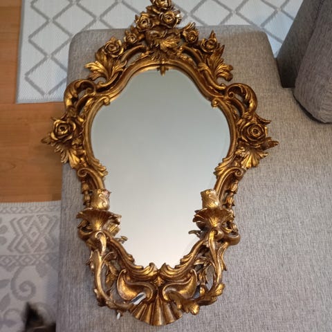 Valkoinen puinen lipasto, jossa suuri keskellä oleva peili. Yläosassa on kaksi pientä laatikkoa peilin molemmin puolin ja alhaalla kolme isompaa laatikkoa metallivetimillä. Pinta on valkoinen ja koristeltu kultaisilla yksityiskohdilla. Materiaalina lakattu ja maalattu puu, laatikoiden sisäpinnat puupintaiset. Kunto hyvä ikään nähden. Kannessa parista kohdasta maali lähtenyt ( kuva) ja vähäistä kulumaa muuallakin. Ikää noin 100v.